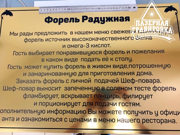 Под воздействием лазерного луча и за счет испарения микрочастиц происходит структурное изменение поверхности материала и появление на нем определенного изображения. Лазерная гравировка позволяет делать рисунки любой сложности. Можно выполнить граверные работы на различных материалах: металл, дерево, пластик, двуслойный пластик, кожа, стекло, оргстекло и резина.